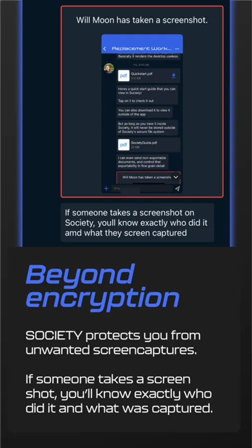 *Apple does not allow SOCIETY to prevent screen capture on iOS, but SOCIETY does let you know when a user takes a screen capture along with their identity by posting this event in the conversation.