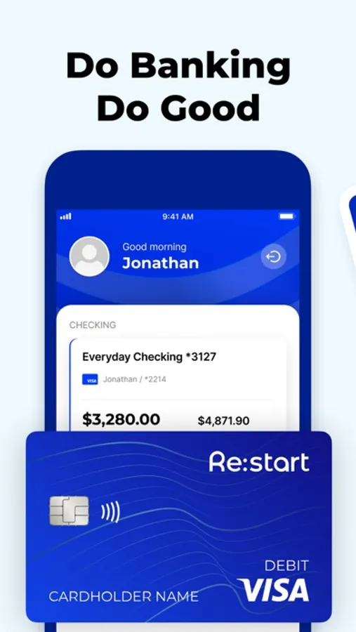 Re:start is a digital bank without fees imposed by traditional banks. Our fee-free app, checking accounts, and Visa® debit cards mean no maintenance fees or minimum balances.
