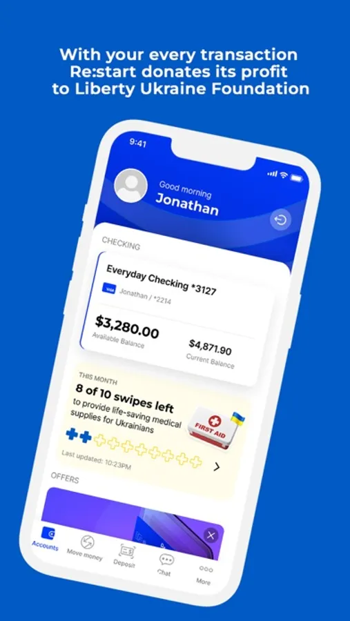 With other banks, you’re a number. With Re:start, you're a giver. With your every swipe, until the end of 2022, we donate 100% of our net profit to Liberty Ukraine Foundation, at no additional cost to you. Through many small (trans)actions, you can make a large impact. See your monthly and all-time social impact in the app.