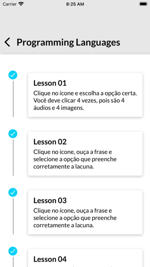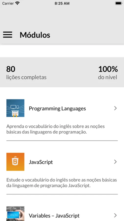 O progresso do usuário é sincronizado em seu dispositivo, de modo que ele consegue visualizar as atividades concluídas e as que ainda não foram estudadas.