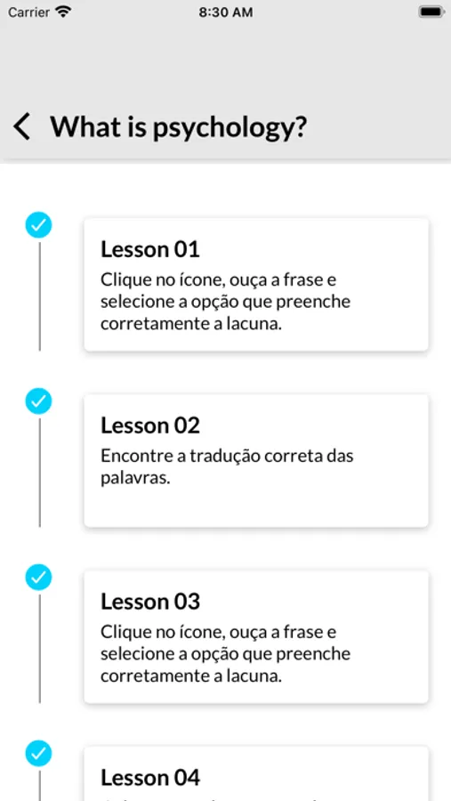 O progresso do usuário é sincronizado em seu dispositivo, de modo que ele consegue visualizar as atividades concluídas e as que ainda não foram estudadas.