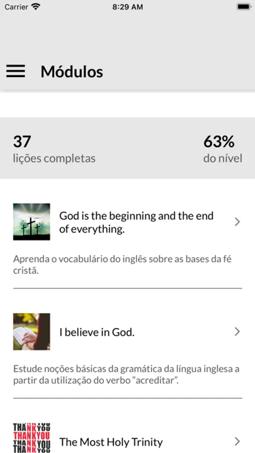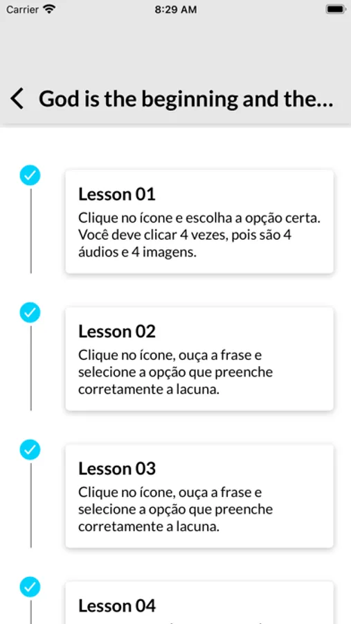 O progresso do usuário é sincronizado em seu dispositivo, de modo que ele consegue visualizar as atividades concluídas e as que ainda não foram estudadas.