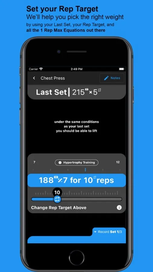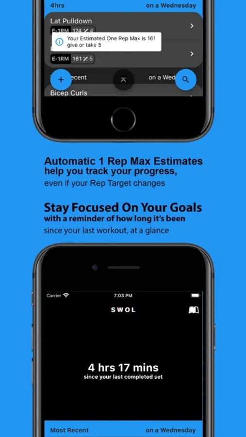 Swol also uses 1 Rep Max Equations to help you with Progressive Overload. It does so by using your Last Set to calculate the max amount of weight you should be able to lift for your selected Rep Target.