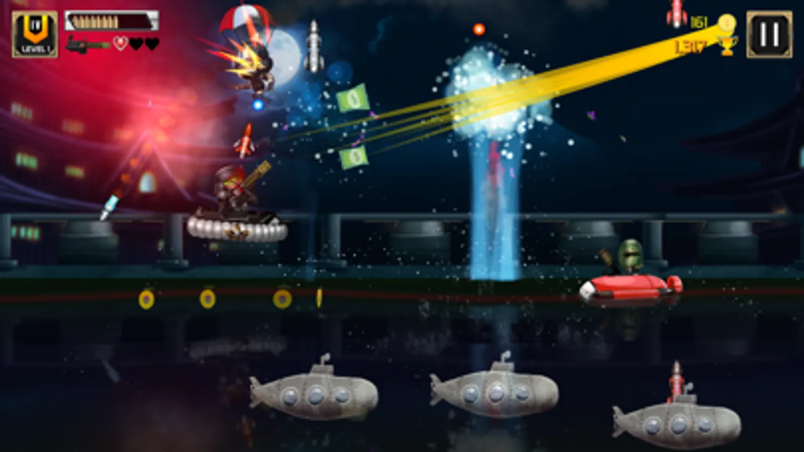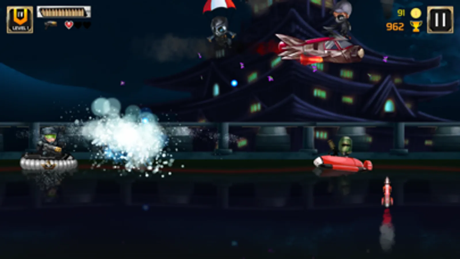 Players will use the Swipe Up to jump, Swipe Down to dive and Hold to move forward, the task is to pass stages with 7 types of enemies: Normal enemies, following enemies, boat enemies, submarines, helicopters, bombers, mines.