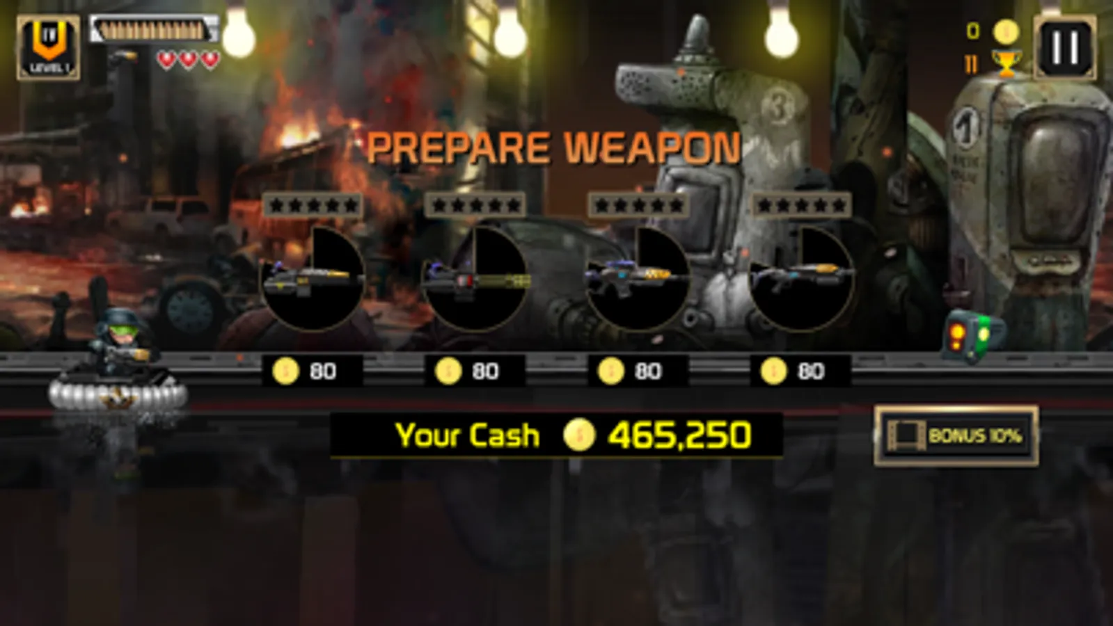 The game includes 5 levels weapons, 10 stages and 5 Vehicles..