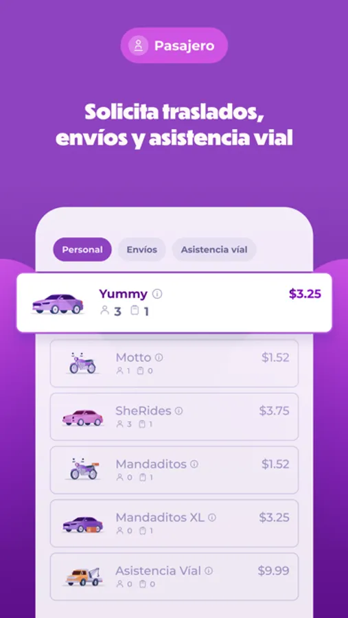 Yummy Rides es una potente app en la que puedas elegir entre el modo Usuario, cuando necesites viajar; o el modo Conductor, cuando quieras trabajar con tu propio carro o moto.
