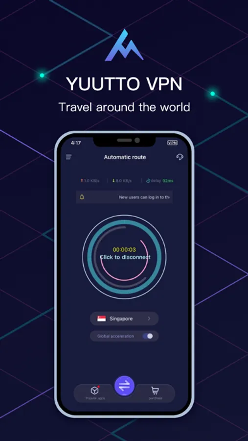 YUUTTO Accelerator(VPN) is a network VPN. Unique intelligent cloud acceleration technology, super bandwidth, unlimited traffic, bring you a smooth network access experience. Special encryption technology and perfect security protection system, anonymous Internet, hide and protect your real IP.