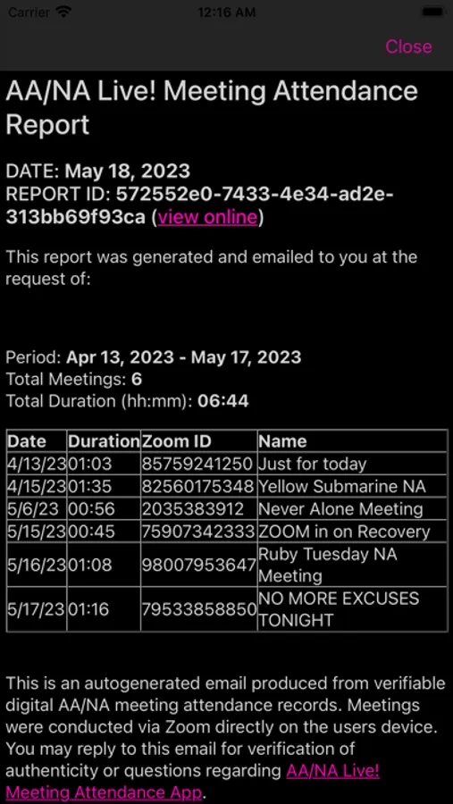 But that's not all. AA/NA Live! offers a range of features designed to enhance your recovery journey. For those seeking meeting attendance verification, our app provides a seamless solution. Say goodbye to the hassle of requesting verification emails from meeting hosts or dealing with an assortment of emails. AA/NA Live! automatically records your attendance upon request, preserving your privacy and generating clean, concise, and verifiable attendance reports.
