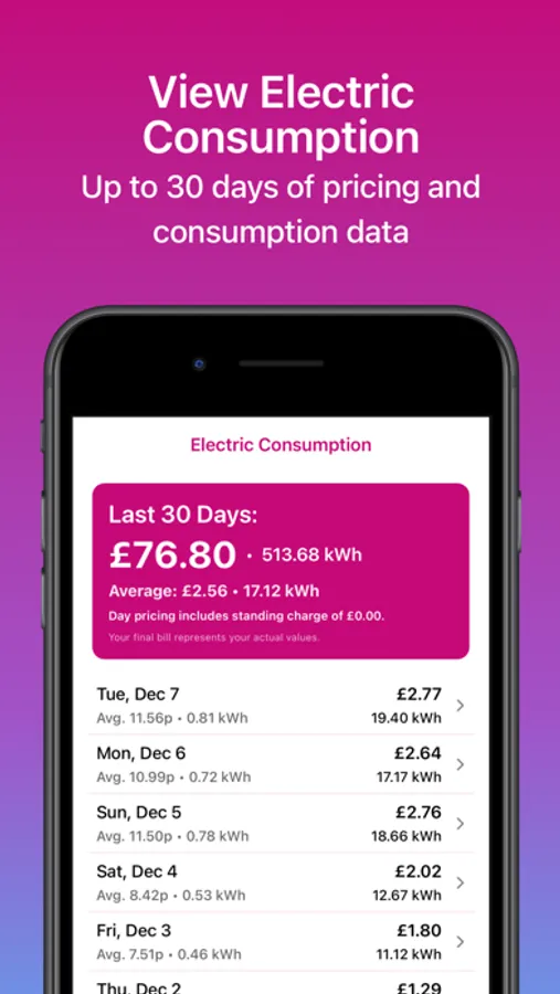 • View Electric Consumption - With daily pricing including half hour slots up to 30 days