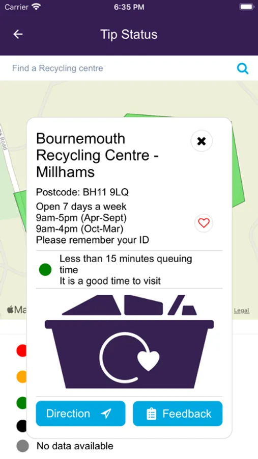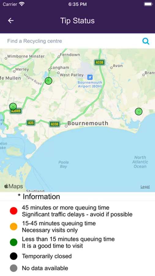 BCP Tip Check tells you how busy the Recycling Centres are before you leave your home. A traffic light system indicates how busy our recycling centres are, whilst giving approximate traffic wait times. BCP Tip Check will also tell you the opening times for all of our recycling centres, along with general information about what you can dispose of at each of our sites.