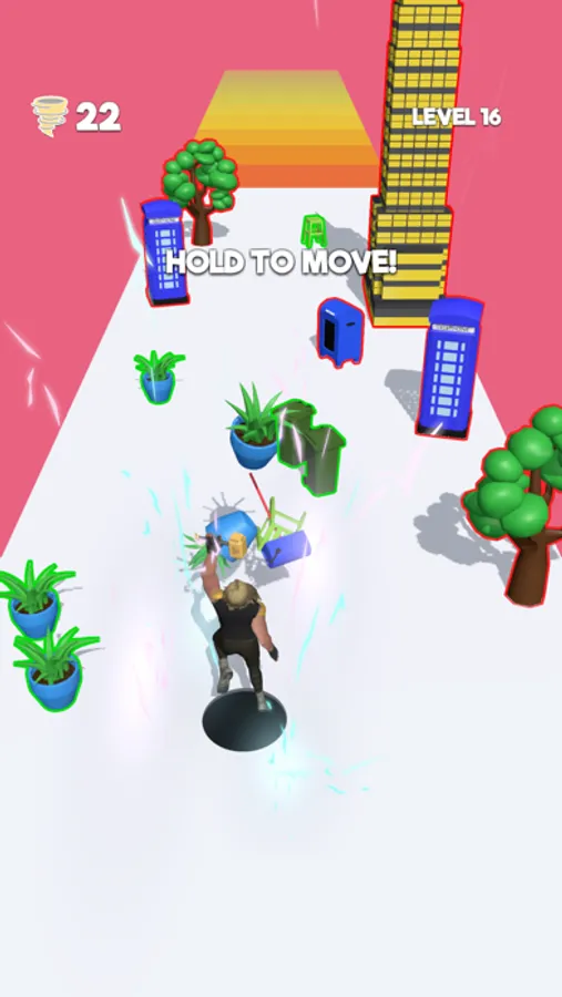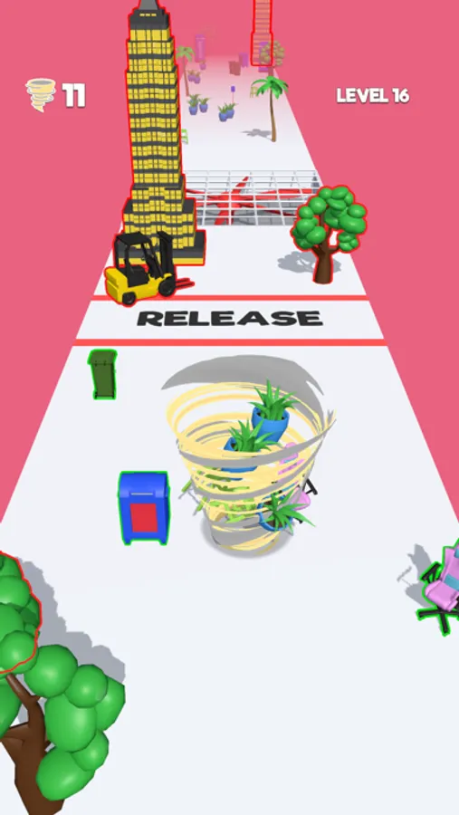 Make a tornado by tapping & holding. The more obstacles you suck in, the bigger you get! Avoid the bigger obstacles that are out of your reach and red-lined. Make sure you did a good work to get more points!
