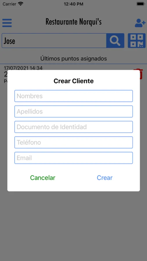- Buscar clientes por nombre, documeto de identidad, teléfono o código de cliente ( QR )