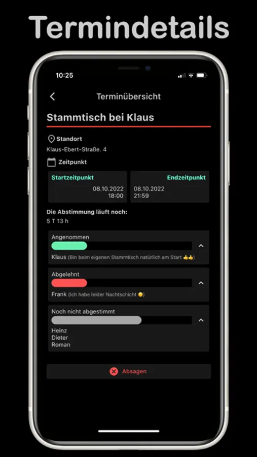 - (In Entwicklung) Stimmt über allgemeine Anliegen z.B. die Wochenendplanung ab, hierbei wird es zukünftig anonyme oder öffentliche Abstimmungen innerhalb der Gruppe geben