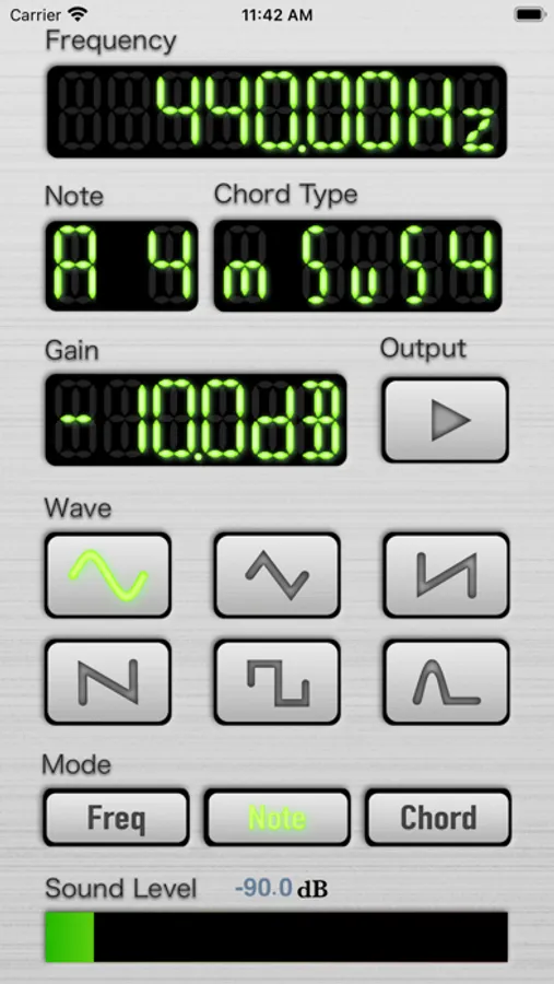 W Generator is an easy-to-use app that can play various types of waves including sine wave from 20Hz to 20kHz. Moreover it provides waves with note names and is able to play many chords with different kinds of waves. Lower frequency wave from 20Hz to100Hz would be too quiet to be heard due to frequency characteristics of iPhone’s or iPad’s default speakers, which would cause higher frequency wave from 18kHz to 20kHz to be so. Higher frequency wave might not be heard because of aged high frequency loss. However, with headphones or add-on speakers which have good frequency characteristics, lower and higher frequency waves might be heard more clearly.