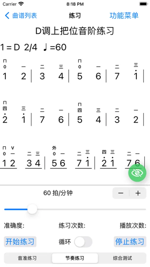 2、节奏练习:可设置任意速度播放曲谱,方便用户进行跟奏,可有效提升初学者的节奏感。
