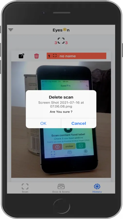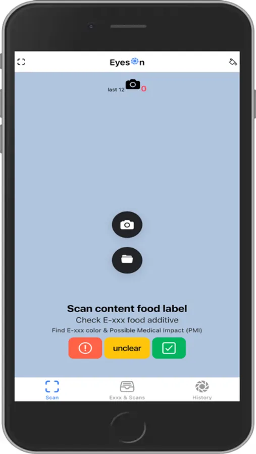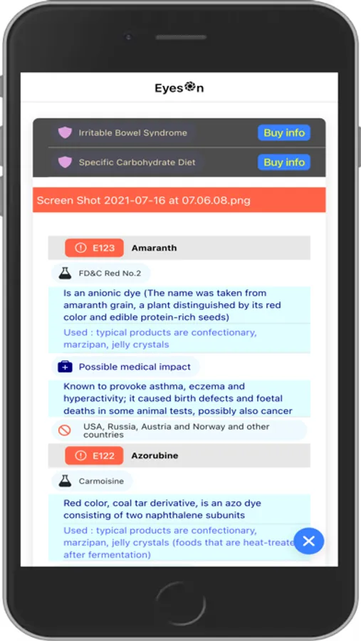 EOF scans a photo [ food content label ]{ using phone's camera or load a photo from phone filesystem} and reports E-numbers details find on it.