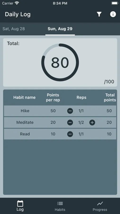 Habit 100 lets you turn each day into a scorecard. Assign point values to each of your habits and goals, and track how well you do at keeping your routine.