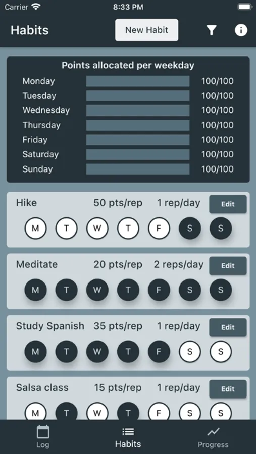 Choose which days of the week you want to complete the habit and use a point value to determine how big of a priority the habit is for you - you can use negative point values for bad habits.
