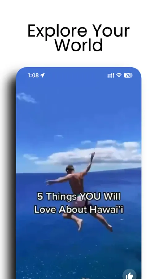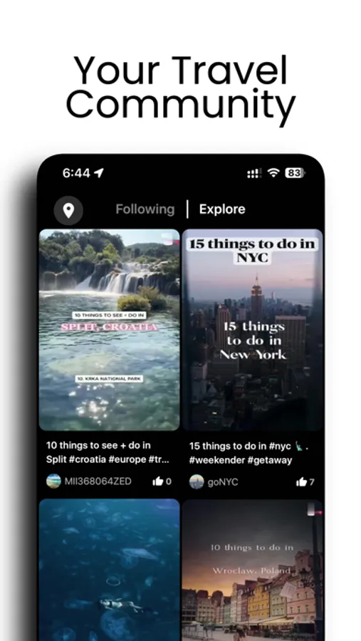 Take a video or upload it from your gallery. Choose to record up to 30-second videos. Upload your own videos and share them with other travelers, with up to 60-second videos. Create your following and find new friends.