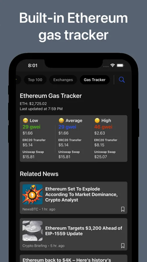Easily check the current Ethereum fees with a built-in gas tracker.