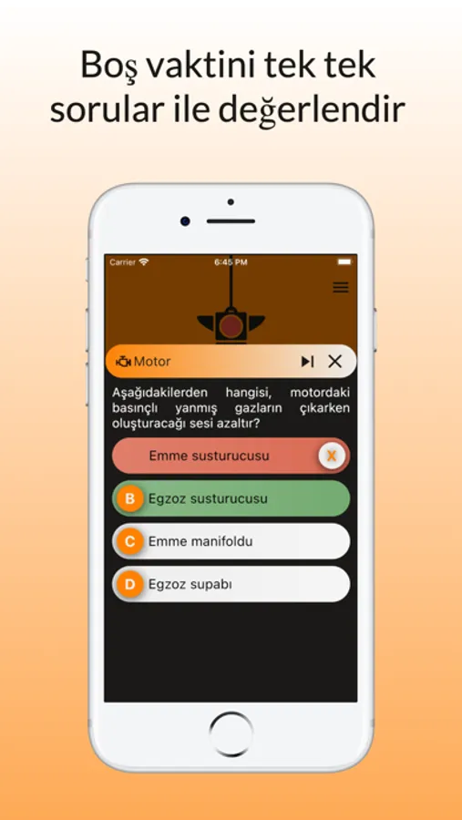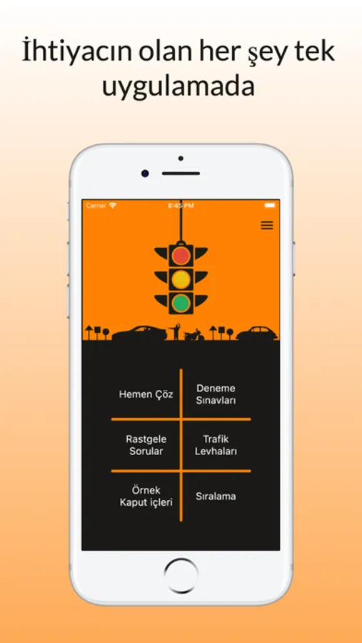 - Ana sayfadan ehliyet sınavına hazırlanırken hemen soru çözme, örnek deneme sınavlarına girme, isteğine göre istediğin konuda ve adette sınav oluşturma, yatay ve dikey işaretlemeleri öğrenme, sınav sonucunu paylaşarak diğer kullanıcılarla yarışma, örnek araç kaputlarındaki motor parçalarını öğrenme ve çözdüğün sorularla ilgili istatistiklere hemen ulaş.
