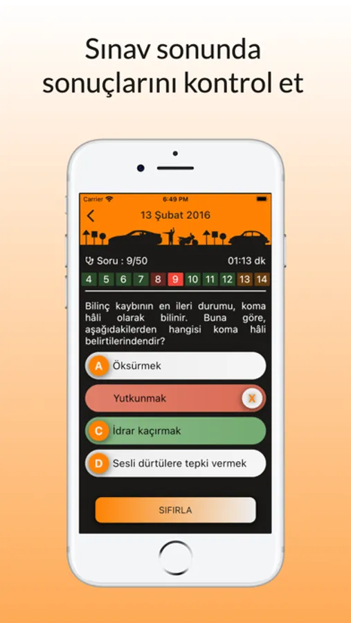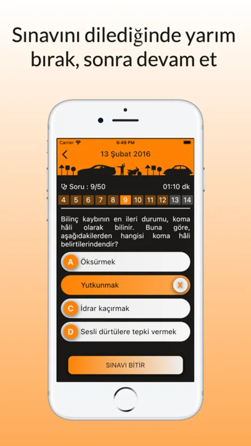 - Denemenizi yarıda bırakıp uygulamayı kapatabilirsiniz. tekrar çözmek istediğinizde kaldığınız yerden devam edebileceksiniz.