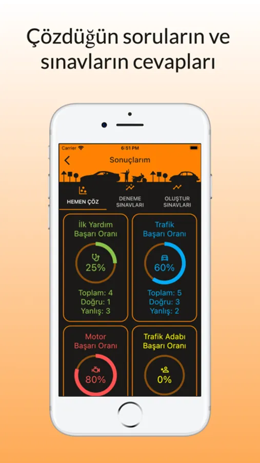 - Sonuçların ekranından uygulama içinde çözdüğün geçmiş sonuçlarına ulaşabilirsin. Hemen soru çöz özelliği ile kaç tane soru çözdüğünü, hangi konulardan soru çözdüğünü ve genel başarını oranını inceleye bilirsin. Geçmişte çözdüğün denemelerden aldığın puanları ve yanlış doğru cevaplarının adetleri bu ekrandan inceleye bilirsin bu sayede deneme çözdükçe gelişimini göreceksin.