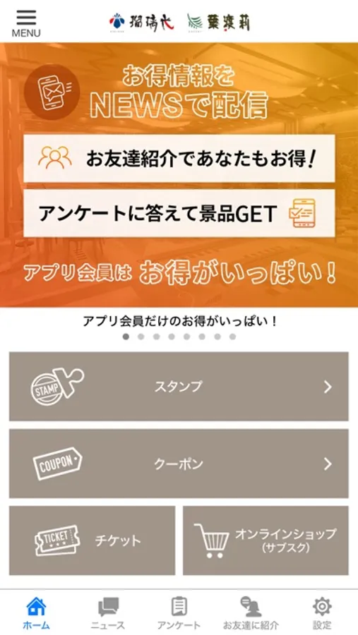 ご来店回数に応じて貯まるスタンプ、会員様だけのお得なクーポンなどのお楽しみがいっぱい。