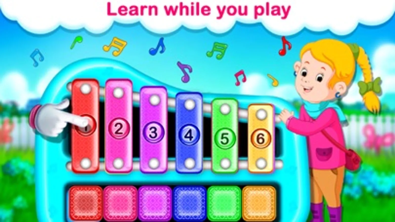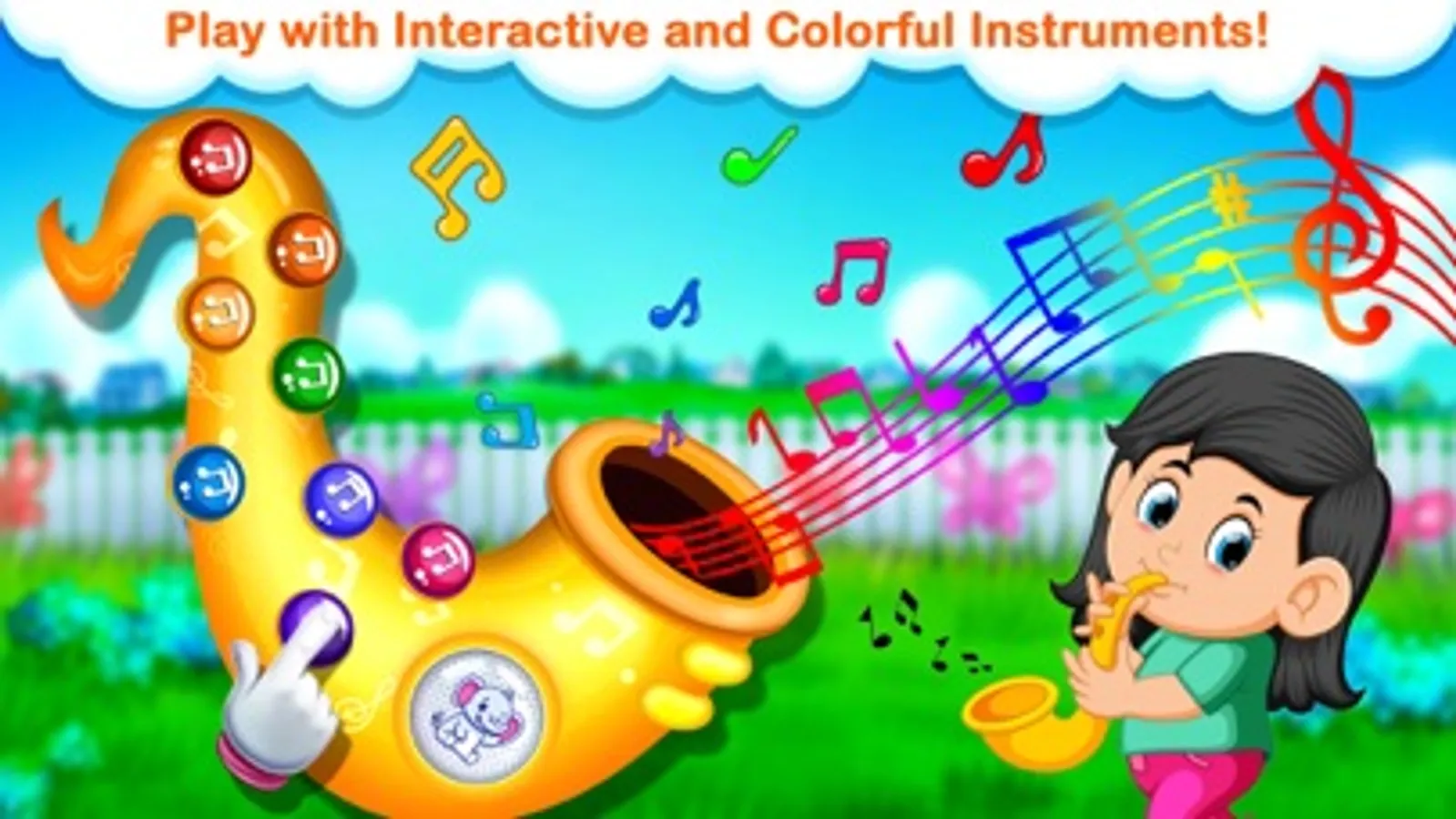 Piano, Electric guitar, Xylophone, Violin, Drums percussion and Flute. Each instrument has real sounds and representation. you can give free rein to their imagination to compose their own melodies in the different instruments.