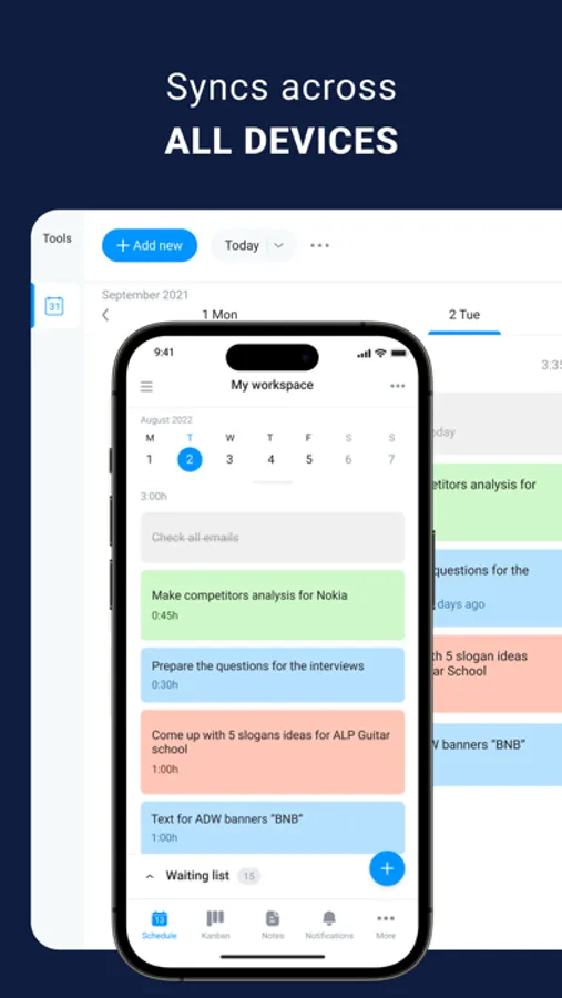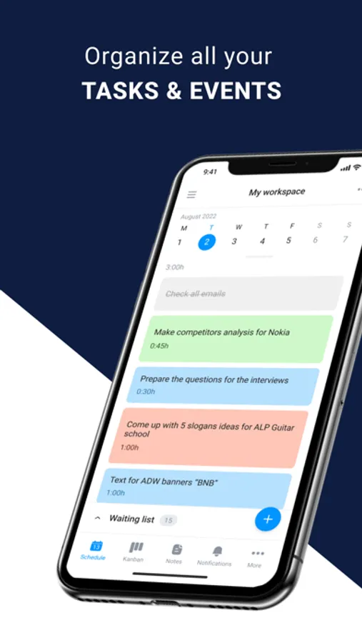 - Waiting list for not yet scheduled tasks, so you don’t forget anything.