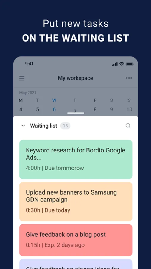 - Develop a habit of capturing all incoming tasks in Bordio. The waiting list is designed specifically for this purpose.