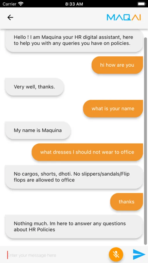 Maquina, HR Assistant manages the conversation with complete attention to you and provides right response. Trained on massive set of organisation and people/ HR policies and further refined on your organisation specific policies. Amyeo is employee experience bot that periodically interacts with you to understand your wellbeing and areas you need support. The app is managed for your organisation/ enterprise.