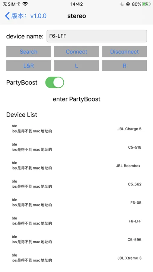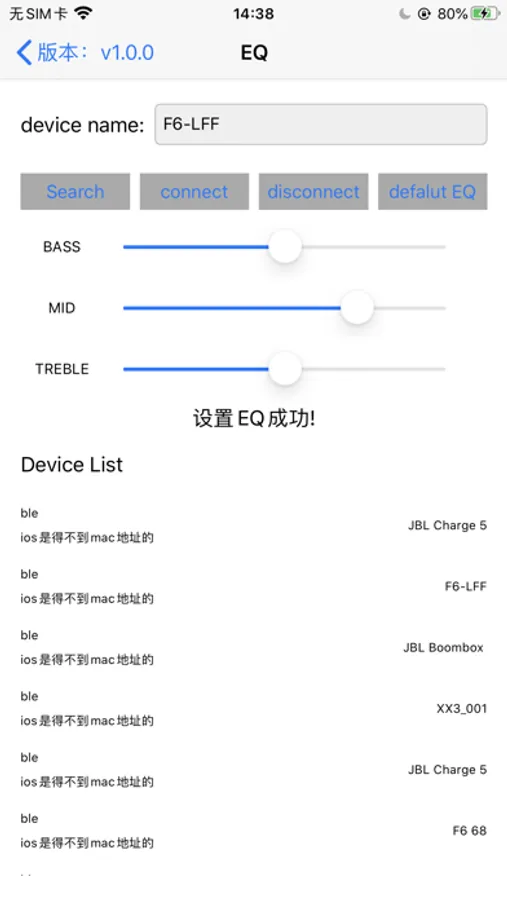 主要功能:OTA升级、查设备电量、查设备版本号、修改设备名、设置Partyboost、设置立体声、设置Tone音、设置Equalizer