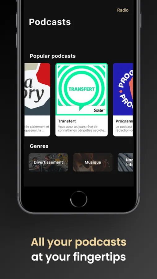 Access thousands of radio stations, reruns and podcasts from around the world. The Virtuose application allows you to easily resume listening to your latest podcast or record your favorite radios.