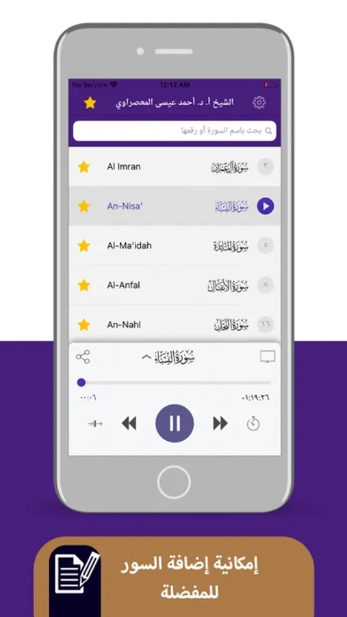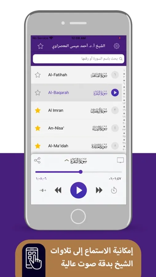 - إمكانية الاستماع إلى تلاوات الشيخ بدقة صوت عالية.
