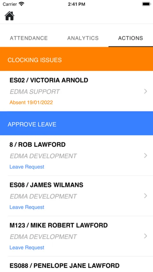 EDMA management app is used in conjunction with EDMA Time and Attendance module and specially designed for management to have a complete overview of time and attendance information for the whole organization. This app has real-time dash analytics, weekly timekeeping data and the ability to manage leave approvals from a mobile device.