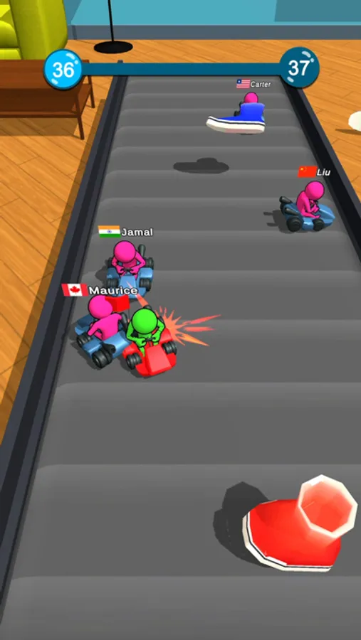 Kick your opponents away by hitting them, stay in line, avoid the objects thrown at you, and be the last one on the track!