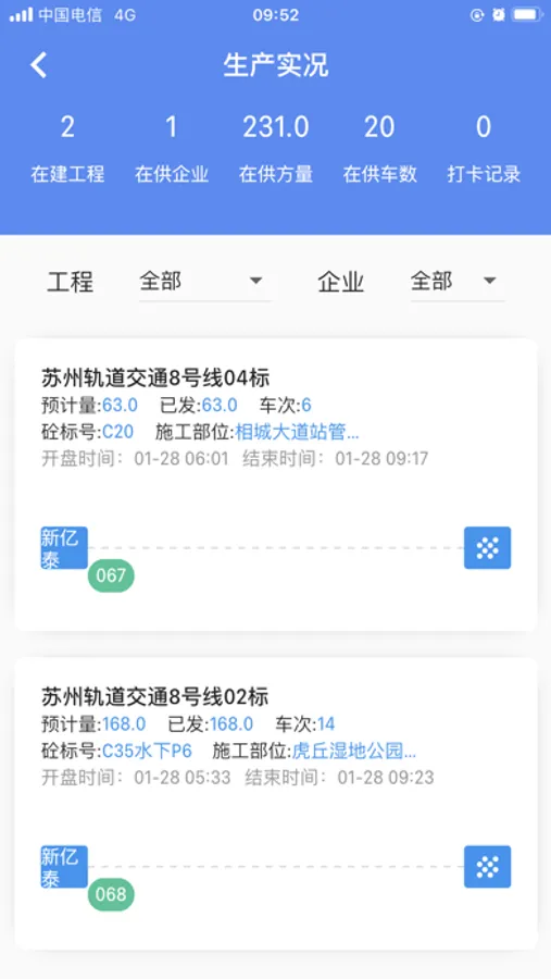 混凝土运输实况查询,生产方量统计,驻场打卡以及查询统计功能