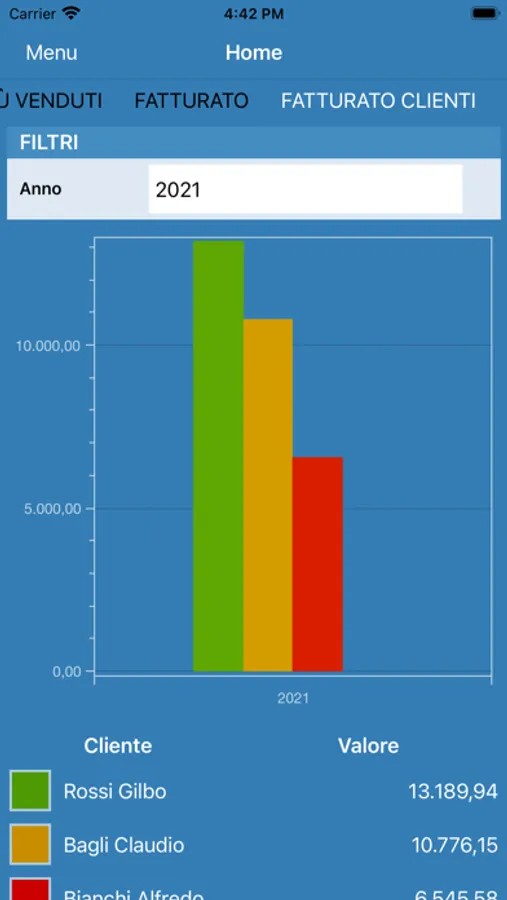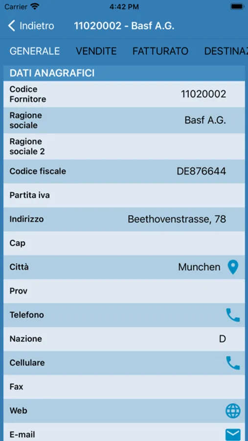Anagrafiche, geolocalizzazione, documenti, scadenze, fatturato, destinazioni diverse, organizzazioni, incassi, note, catalogo prodotti, listini e sconti.