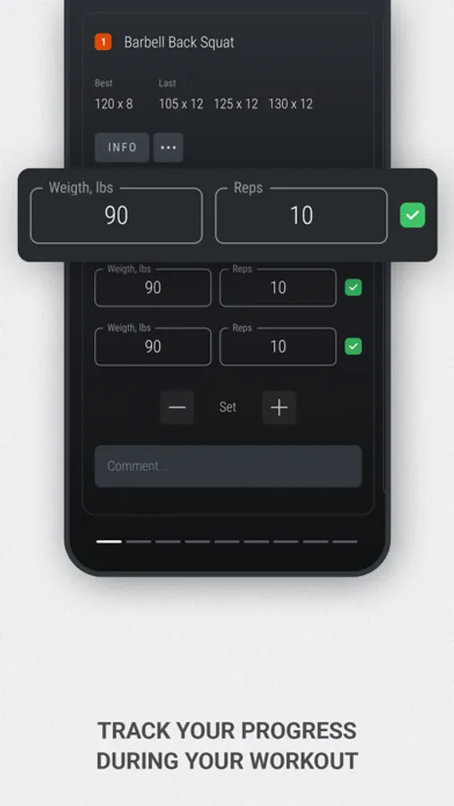 Mark the exercises you’re done with, add weight, reps and sets, total workout time and more during the workout.
