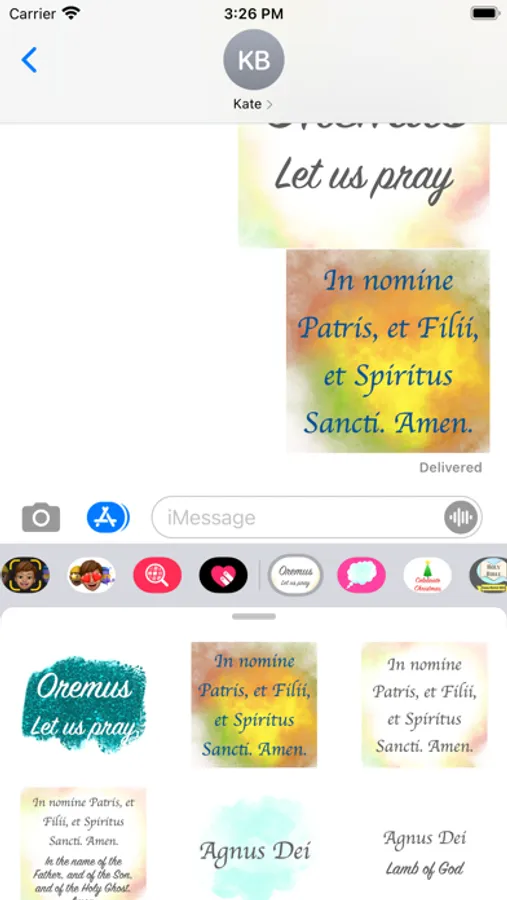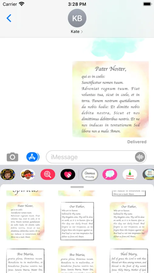 - prayers: Our Father, Hail Mary, and Glory Be, in both Latin and English