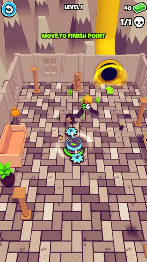 Control this awesome robot with one finger and clear all opponents and rooms.