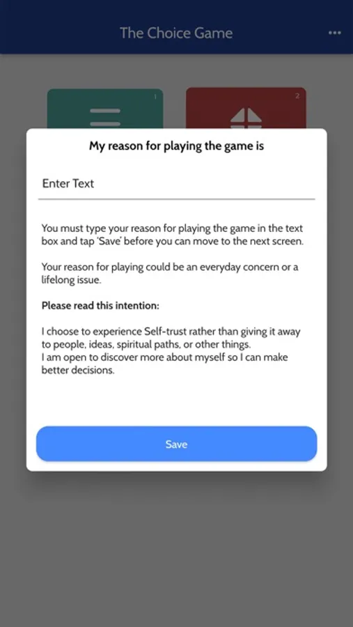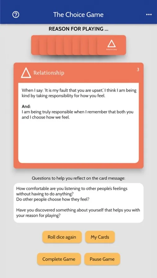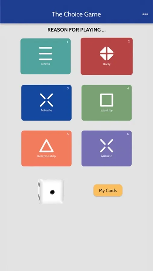 You start the game by typing your reason for playing, which could be an everyday concern, a present challenging situation, or a lifelong issue. Then you tap to roll the dice and select a card.