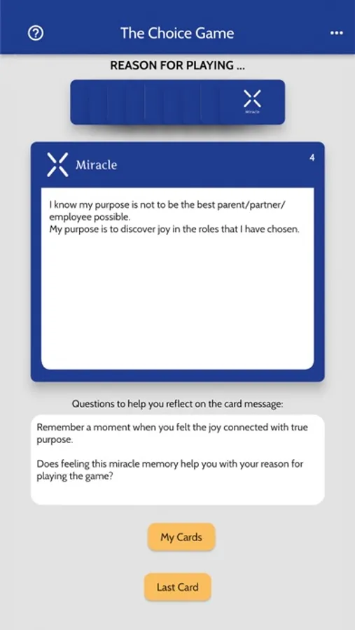 The Choice Game App is based on a physical ‘Pocket Game’ that is a mini version of the original Miracle Choice board game. The 70 card messages were created specifically for you to experience self-trust.