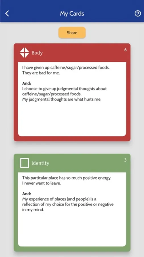 The Relationship, Identity, Needs and Body cards help you see how you might be giving your self-trust away. They then give examples of choosing self-trust.