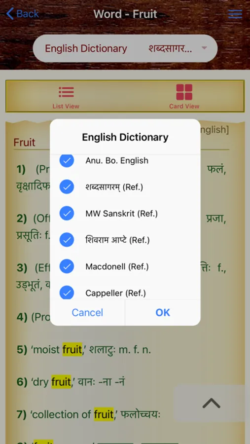 सं-Dictionary 360° : A Sanskrit to English dictionary with an extensive collection of over 221,000 sanskrit words and 46,200 english words spanned across 7 dictionaries, its different english meanings, gender, forms, etc. as described in the respective dictionaries. It has few features that include