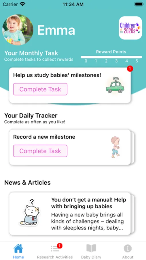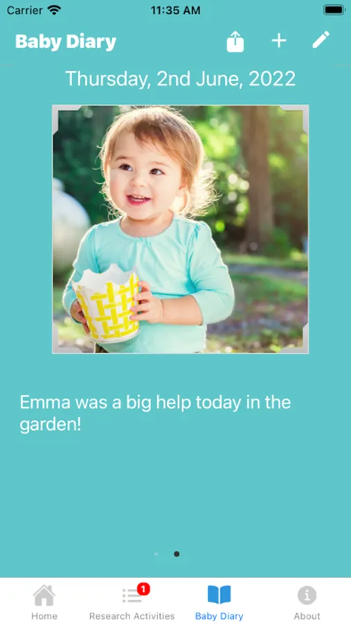 In addition to study participation, the Children of the 2020s mobile app provides a Baby Diary that allows parents to capture their children's most precious photos and videos.