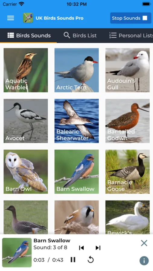 Birds can be grouped by family or alphabetical order, with and without headings, using the Birds Sounds settings.