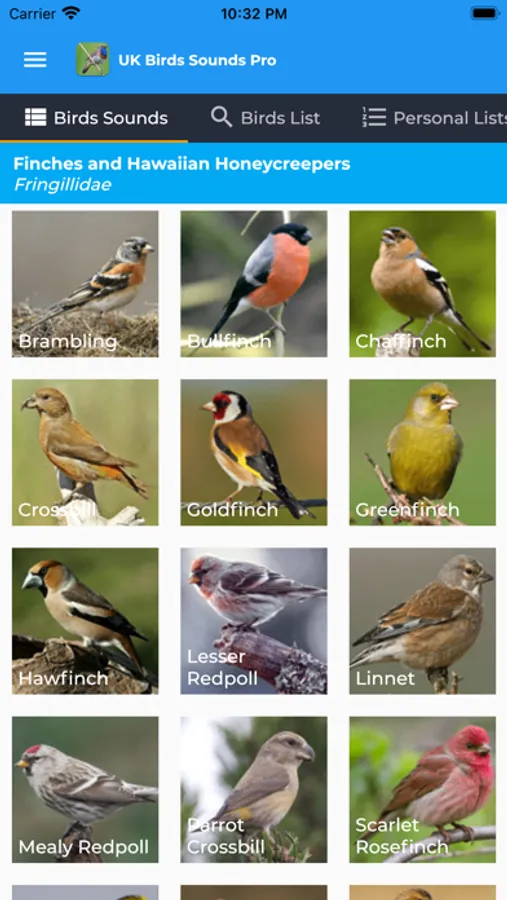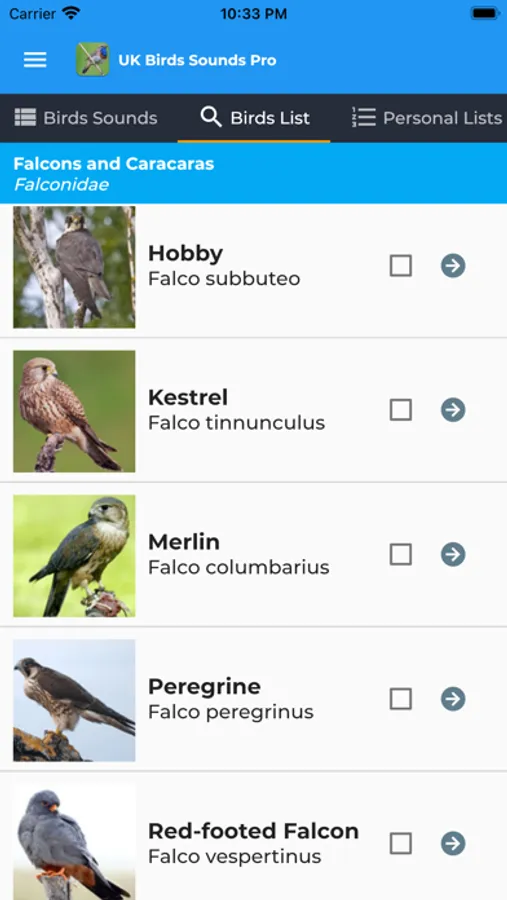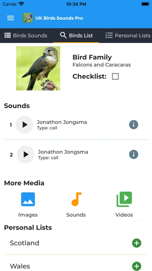 Personal Lists can be created too! Create a list of your favourite birds, or add birds that you've seen on a recent bird watching trip. Birds can be added to your lists from each birds species screens.
