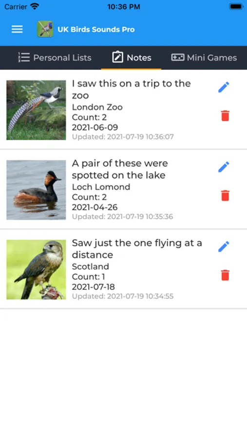 Fields notes can also be created! Allowing you to document each bird sighting.
